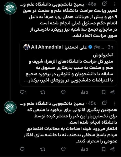 توییت بسیج دانشجویی دانشگاه علم و صنعت درباره تغییر ریاست حراست